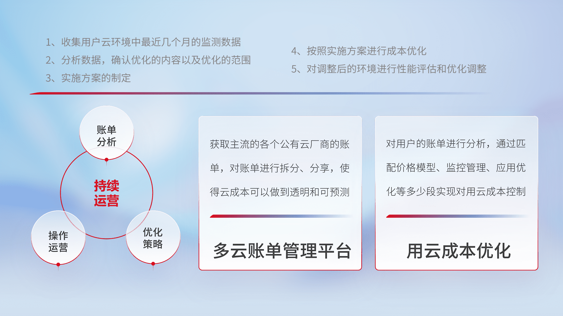通过多云纳管,,,以统一的资源数据模型把客户的云资源进行抽象和封装,,进而实现对多云资源的统一操作,,保障云资源管理的可靠性、、稳定性与可用性。。量身定制化运维内容,,,配置、、、、开发运维、、补丁管理、、、备份、、、、监控、、认证和访问管理、、、审计和日常巡检等,,,,保障在用云过程中的可靠度,,,,稳定度以及高可用率。。。